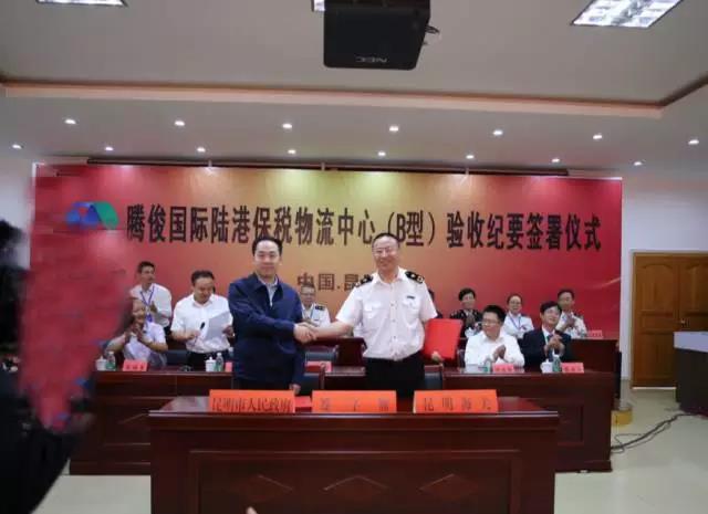 昆明海關副關長馬軍與昆明市人民政府副市長洪維智簽署了《騰俊國際陸港保稅物流中心基礎和監(jiān)管設施驗收紀要》。昆明市人民政府高庚副秘書長、晉寧區(qū)人民政府李福軍區(qū)長、昆明市商務和投資促進局徐增雄局長、及省、市、區(qū)各級有關部門負責人參加了驗收工作。